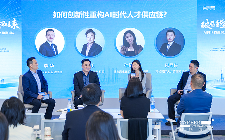 圆桌讨论环节,由JN江南JN SPORTS国际业务总经理李华主持,开利亚太总部招聘总监邹羽、招商局集团资深AI产品经理孙敬萍、JN江南JN SPORTS国际人力资源总经理陆同伟三位专家,分别从外资、央国企和民企视角,围绕AI时代人才供应链创新性重构话题展开深度对话。